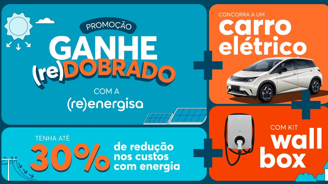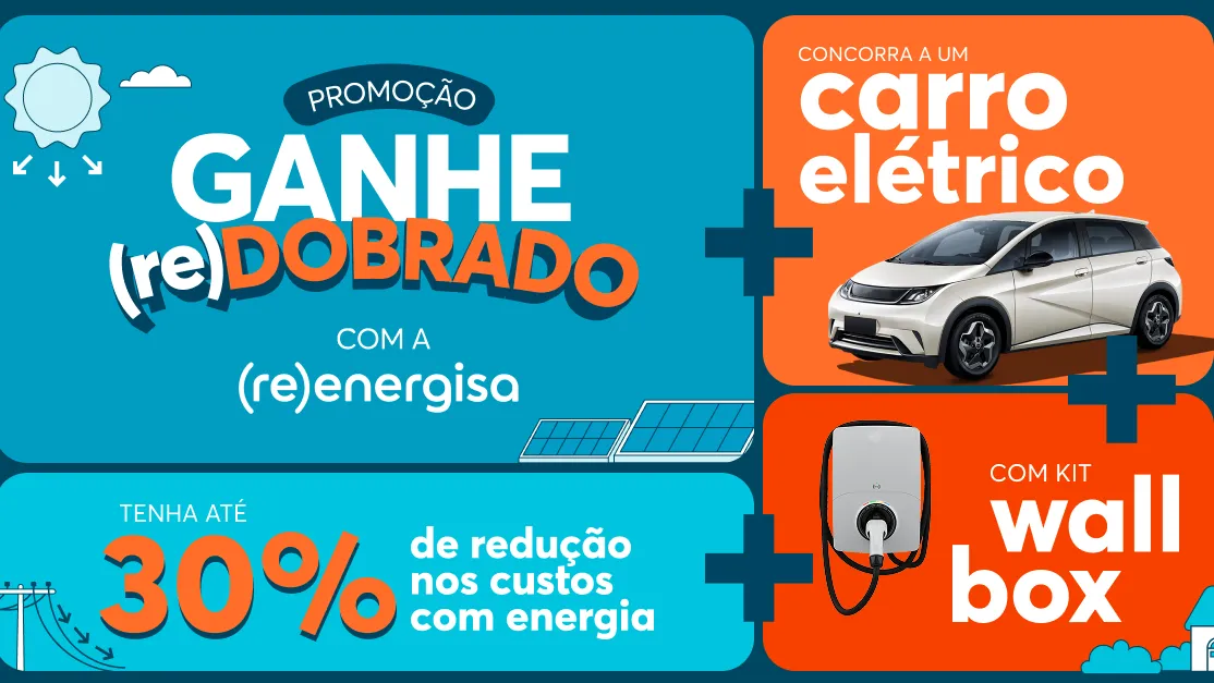 A Promoção ganhe (re)dobrado com a (re)energisa une duas grandes vantagens: economia para o agora e inovação para o futuro. Afinal, ao aderir à energia solar compartilhada, você amplia seus benefícios, contribui com a transição para um futuro mais limpo e sustentável, e ainda pode levar para casa um carro elétrico com wallbox para chamar de seu.