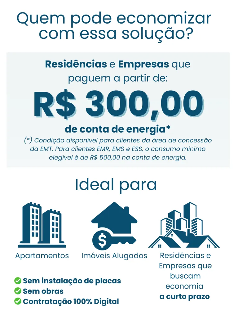 Qualquer pessoa física (CPF) ou jurídica (CNPJ) que tenha o custo de energia mensal igual ou superior a R$ 500,00 (Com consumo mínimo a partir de 500 kWh). Atuamos nos estados de CE, MA, MG, MS, MT, PI, PE, RJ e SP.