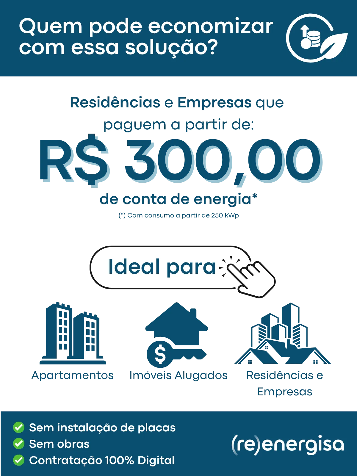 Qualquer pessoa física (CPF) ou jurídica (CNPJ) que tenha o custo de energia mensal superior a R$ 300,00. Para clientes CPF atuamos nos estados de CE, MA, MG, MS, MT, PI, PE, RJ e SP e para CNPJ atuamos em CE, MA, MG, MT, MS, PI, PE, RJ e SP.